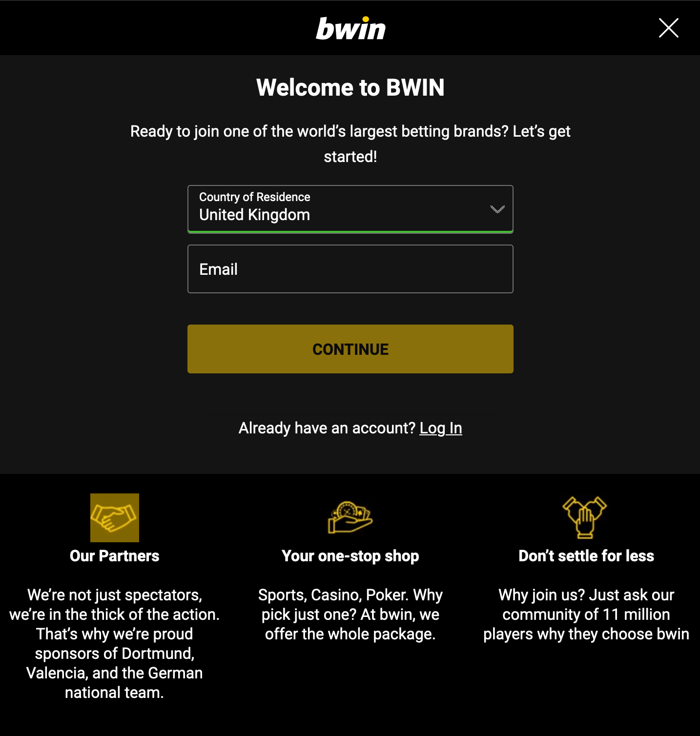 The registration button, like many other bookmaker sites, is located on the right side of the site header. Clicking on it will see just such a mini-questionnaire, which asks only to a potential client residing and their email address. But the administration's inquiries about Bwin's new customer will certainly not end there.